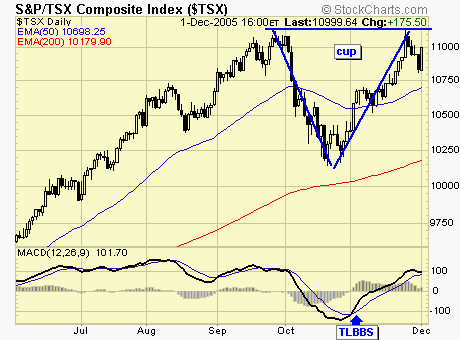 The Toronto index, which is heavily weighted in oil and energy stocks, currently on a buy signal, is in the process of completing a "cup with handle" pattern, and upon a breakout, should see another 1000 points.