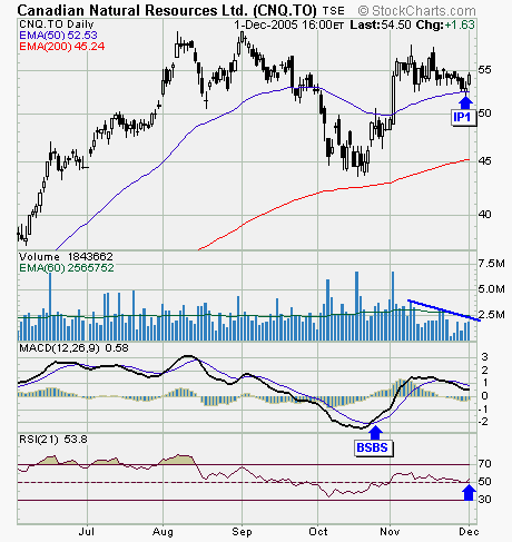 CNQ - for stock lovers, we have a possible IP1 on CNQ. This chart shows off our trading model perfectly: Prices corrected to the 200ema support and gave us a bull market buy signal, then a month long consolidation on declining volume, and now follow up with an IP1. What more can we ask for?