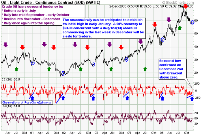 The seasonal low in crude oil is now in place. As seen in the precious metals a month earlier, the stocks have lead the commodity off the bottom. The seasonal rally can be anticipated to make its initial rally into January. Traders can look forward to a sale into a 50% retracement ($63.30) coupled with a daily RSI(14) above 65 commencing in the last week of December.